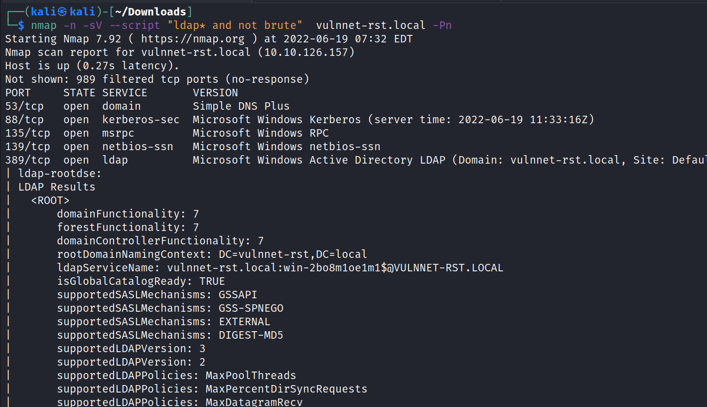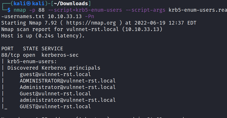 version: VI. 0.3 (9dad6e1) (kali@ —/Down10ads $ ./kerbrute userenum vulnnet-rst. local --dc -d 07:29. 07 •.29. 07 •.30. 07:36. 07:36. vulnnet-rst.local userlist. txt - 06/19/22 - Ronnie Flathers Oropnop 2022/06/19 2022/06/19 2022/06/19 2022/06/19 2022/06/19 2022/06/19 > Using KDC(s): vulnnet-rst. local : 88 •55 •28 • 12 •13 VALID VALID VALID VALID USERNAME : USERNAME : USERNAME : USERNAME : guestövulnnet-rst . local administratorövulnnet-rst . local Guestövulnnet-rst . local Administratoravulnnet-rst . local
