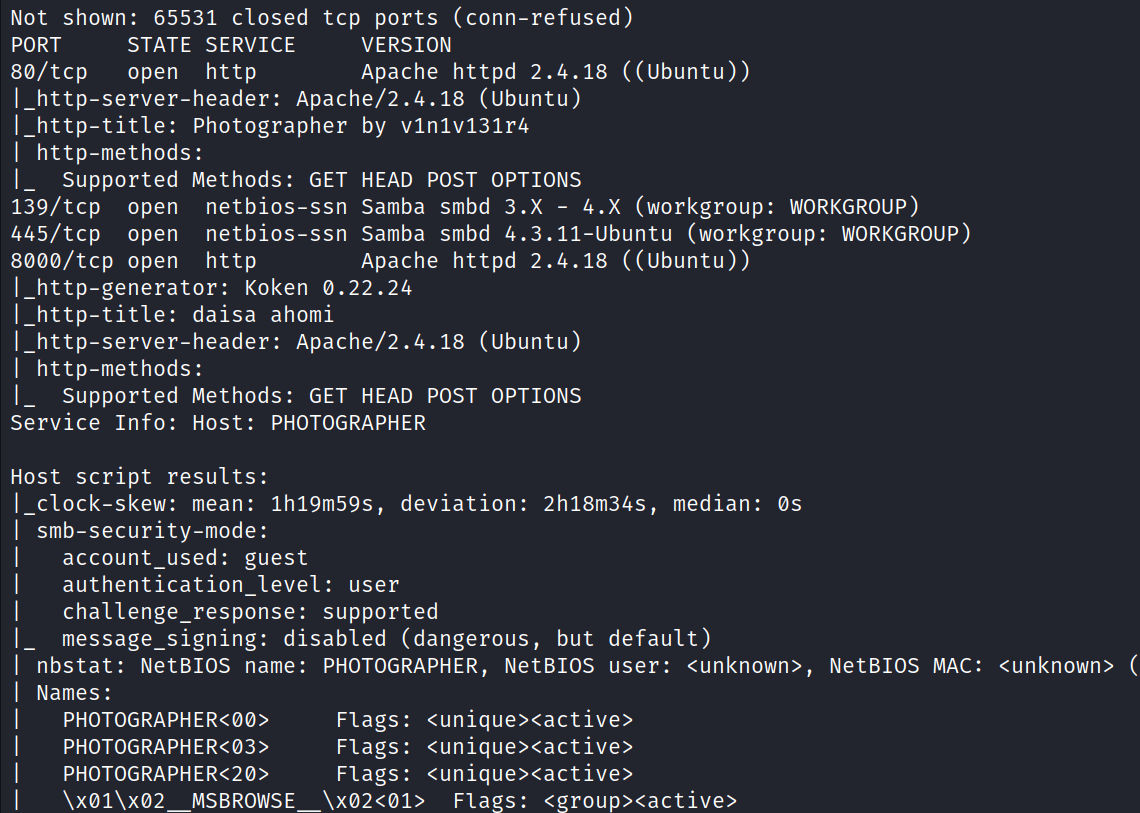 ![kali@ kali smbmap -H 192.168.43 .174 [+] Guest session 192.168.43.174 Disk print$ w: 192.168.43.174. • 445 Name: sambashare IPC$ kaliS Permissions NO ACCESS READ ONLY NO ACCESS Comment Printer Drivers Samba on Ubuntu IPC Service (photographer se](photographer/media/image3.png)
