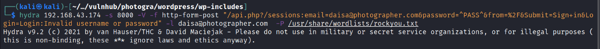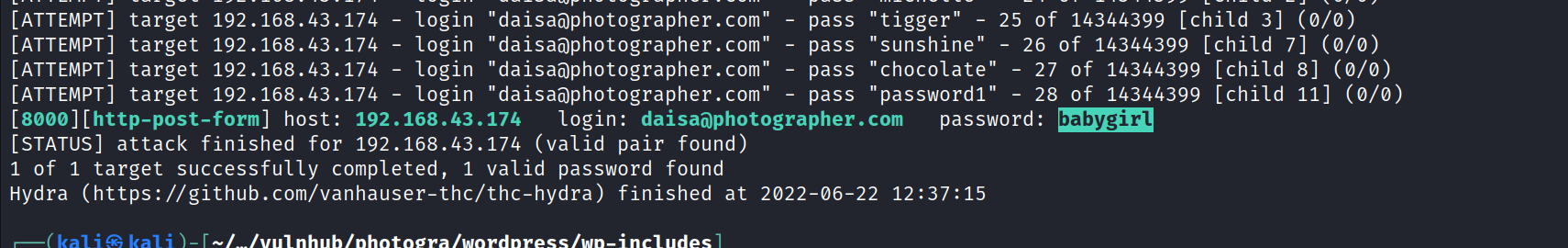 ![(kaliS —/Desktop/ctf/vu1nhub/photogra $ john --wordlist=/usr/share/wordlists/l [sudo] password for kali: using default input encoding: UT F-8 Loaded 1 password hash (bcrypt [Blowfish 32/64 Cost 1 (iteration count) is 256 for all loaded Will run 4 OpenMP threads Press 'q' or Ctrl-C to abort, almost any other babygirl lg DONE (2022-06-22 13:19) 4.761g/s "—show" option to display all of the c Use the Session completed.](photographer/media/image18.png)