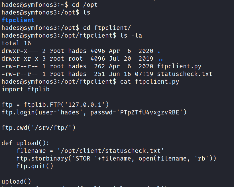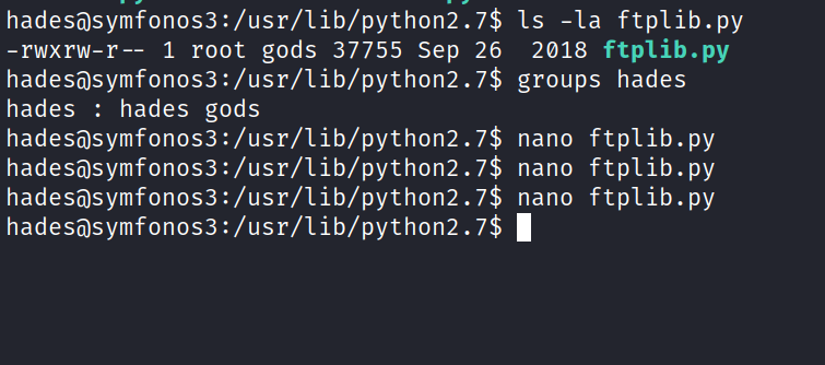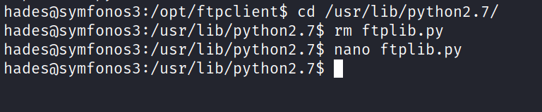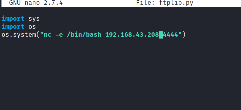 The only interesting thing we know about the system is that there’s file called ftpclient.py in /opt/ftpclient/ running as root, we saw that in pspy output. And it connects with ftp using ftplib.py. If we can edit that(ftplib.py)imported file we can get a root reverse shell through that.**